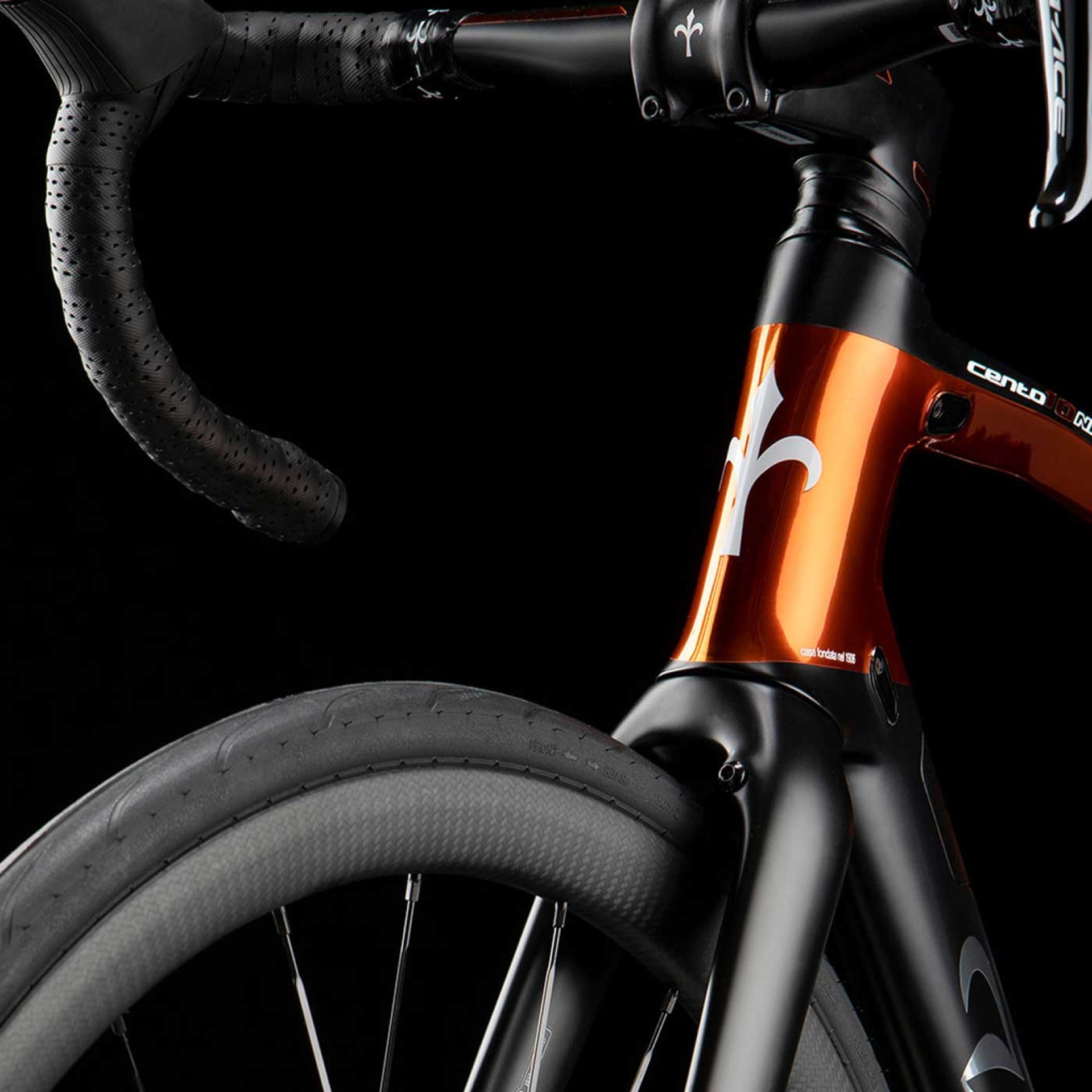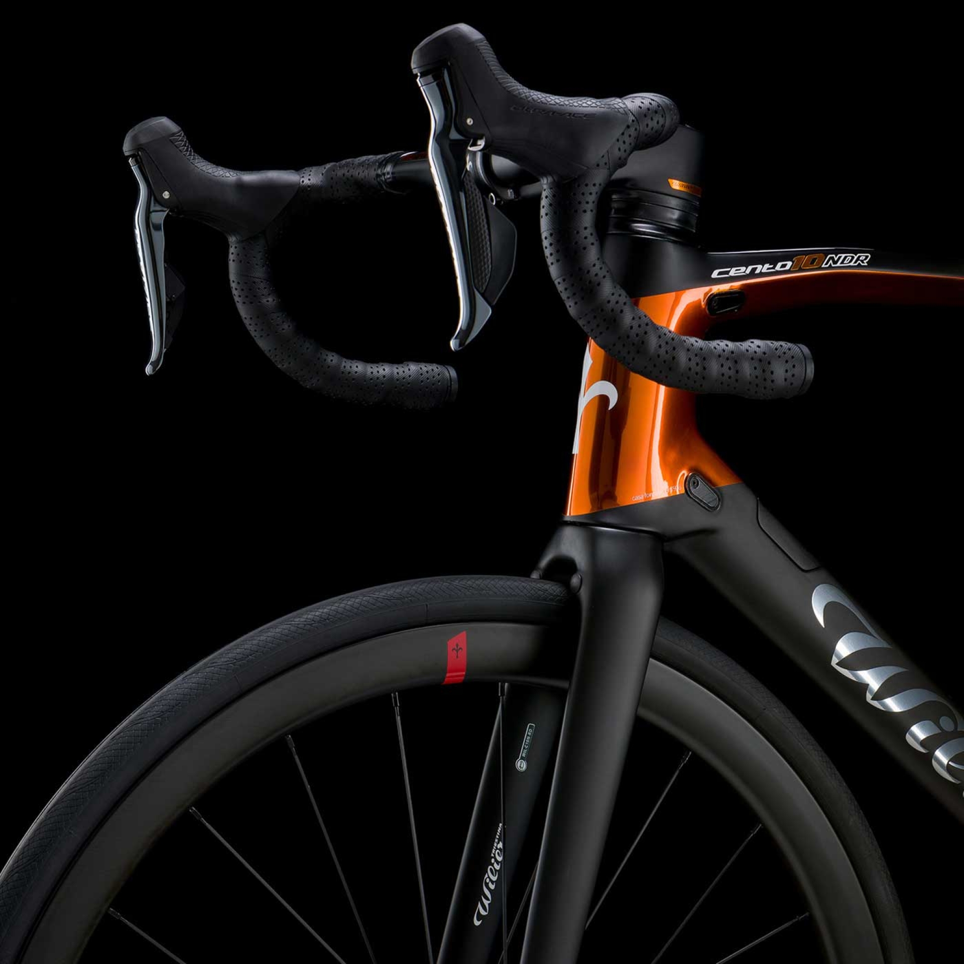 Am Cento10NDR entwickeltete Wilier den RAMATO-Look weiter: Neben der Rahmenlackierung ergänzte Wilier Stemma und Barra mit einem Hauch von KUPFER, also den Lenkeranschluss und den Monocoque-Carbon-Bogen, der die Züge im Rahmen integriert. Mit dieser weiteren Individualisierung wird diese Version des Cento10NDR wirklich einzigartig.